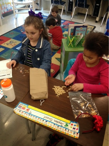 We had lots of fun learning on the 100th Day of school. It is hard to believe that we have been in first grade for more days than we have left. Thanks to all the parents who sent in supplies to help make our 100th day more special!! We first rotated in groups to complete several different stations.